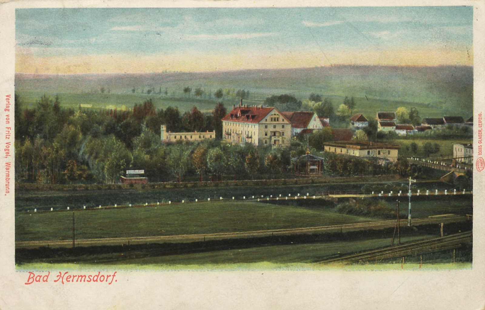 1916 , Panorama Jerzmanowic-Zdroju - w środku dawny Kurhaus - ob. Zakład Poprawczy.Skomentuj zdjęcie |
