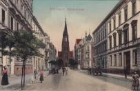 Lata 1907-1912 , Widok z ul. Mariackiej (dawniej Holtzestrasse) na kościół Niepokalanego Poczęcia NMP.Skomentuj zdjęcie