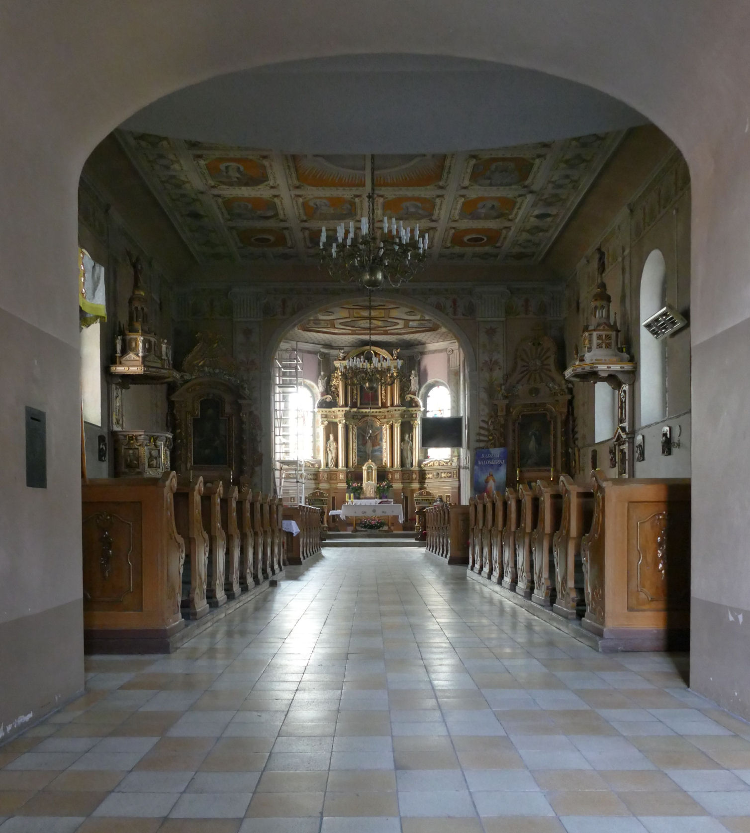 0 pobrań 501 odsłona 5.83 średnia ocen Poprzednie i następne zdjęcia cracusiac Obiekty widoczne na zdjęciu Kościół św. Mikołaja więcej zdjęć (8) Zbudowano: 1865 Kościół parafialny wzmiankowany jest po raz pierwszy w 1325 r. Niestety brak jest szczegółowych informacji. Można tylko przypuszczać ze była to niewielka, drewniana świątynia, która najprawdopodobniej spaliła się. Od XVI wieku wieś w ręku dwóch rodzin tj.: Kunowskich i Słaboszewskich. Podczas wizytacji w 1575 roku kościół wymieniany jest jako nowo wybudowana, drewniana świątynia. Zapewne też do połowy XIX wieku w takiej formie przetrwał. Nowy murowany kościół został wzniesiony przez kolejnego właściciela wsi, Jana Dębskiego w 1865 roku. Jednak jako obiekt stosunkowo mały zostaje rozbudowany w latach późniejszych. W 1877 założono na wniosek Józefa Dębskiego księgę oszczędnościową na budowę fundamentów pod nowy kościół. W 1878 r. w użytkowanym, starym kościele przeprowadzono naprawę organów, a w 1882 r. wybudowano wolno stojącą dzwonnicę, położoną w północnej części terenu należącego do parafii. ŚCIANY: Kościół murowany z cegły, na cokole ociosanych kamieni, powyżej cokołu otynkowany SKLEPIENIA I STROPY: W piwnicach stropy cementowe, w nawie kościoła i w prezbiterium stropy zwierciadlane, w kaplicy po stronie północnej sklepienia krzyżowe. WIĘŹBA DACHOWA: Więźba dachowa drewniana, stolcowo - płatwiowa z wmontowaną po stronie wschodniej osobną więźbą dla sygnaturki POKRYCIE DACHU: Dach kościoła kryty dachówką karpiówką, hełmy wieży i sygnaturki kryte blachą miedzianą. POSADZKI, PODŁOGI: W piwnicach wylewka cementowa, posadzki w nawie i prezbiterium z kwadratowych płytek ceramicznych. SCHODY: Schody wewnętrzne; w części zachodniej schody wiodące na chór muzyczny, drewniane z podstopniowcami, jednobiegowe z zakrętem. Schody z chóru muzycznego na poddasze i dalej na dzwonnicę drewniane, jednobiegowe, o konstrukcji policzkowej bez podstopnic. Schody zewnętrzne cementowe, jednobiegowe, przy kruchcie północnej flankowane prostymi, metalowi balustradami. OTWORY OKIENNE I DRZWIOWE: Okna w większości witrażowe, w ramie metalowej, dodatkowo wzmocnione poziomymi lub pionowymi listwami metalowymi. Drzwi główne dwuskrzydłowe o konstrukcji ramowo - deskowej. Drzwi wejścia bocznego po stronie południowej dwuskrzydłowe, ramowo - płycinowe z półkolistym, wielopodziałowym nadświetlem. Do kruchty w północno-wschodniej części kościoła prowadzą dwa otwory wejściowe; po stronie wschodniej pojedyncze drzwi o konstrukcji ramowo-płycinowej, po stronie zachodniej drzwi o identycznej konstrukcji. Drzwi do przedsionka kaplicy po stronie północnej nawy; drewniane o konstrukcji ramowo-deskowej. Bryła Bryła kościoła zwarta, z dominującym korpusem głównym. Prezbiterium nieznacznie obniżone względem nawy. Całość jednokondygnacyjna, podpiwniczona w części północnej (krypta grobowa rodzin Dąmbskich i Lubomirskich). Dach nawy głównej dwuspadowy, prezbiterium wielopołaciowe. Przybudówki kryte dachami spadowymi, jedna po stronie północnej dachem pulpitowym. Po stronie zachodniej wieża równa wysokością nawie, zwieńczona hełmem. Po stronie wschodniej korpusu nawy sygnaturka. Elewacje ELEWACJA FRONTOWA(zachodnia) - trzyosiowa na niewysokim cokole, flankowana wysokimi pilastrami. W części centralnej przyziemia prostokątny otwór wejściowy w nieznacznie zryzalitowanym portalu sięgającym połowie wysokości elewacji, flankowany kolumnami doryckimi wspierającymi gierowane belkowanie. Założenie portalowe wieńczy łukowaty naczółek ozdobiony wykonanym w tynku "Okiem Opatrzności". Po bokach portalu niewielkie pionowe okna zamknięte łukiem półokrągłym, w płaskich obramieniach. Górna część elewacji w partii środkowej nieznacznie zrezalitowana (na szerokość portalu), ryzalit flankowany pilastrami identycznymi do pilastrów spinających całą elewację. Na osi ryzalitu, ponad naczółkiem portalu okulus. Po bokach ryzalitu otwory okienne analogiczne do opisanych dla dolnej partii elewacji. Zasadniczą cześć elewacji wieńczy gzyms okapowy. Ponad nim, na osi wieża, w dolnej partii flankowana trójkątnymi ścianami szczytowymi dachu. Pionowa, prostokątna ściana korpusu wieżowego posiada w dolnej partii wysoką, pionową płycinę zamkniętą łukiem półokrągłym. W płycinie przeprutowej w górnej partii okulusem, figura Chrystusa Dobrego Pasterza. Zasadnicza część wieży, zwieńczona profilowanymi gzymsami przechodzi powyżej nich w formę wieloboczną, niewysoką, przeprutą jednym, pionowym oknem zamkniętym łukiem półokrągłym. Całość wieńczy dwuczłonowy, barokizujący hełm. ELEWACJA POŁUDNIOWA - ośmioosiowa, na niewysokim cokole, podzielona płaskimi pilastrami na pionowe, prostokątne płyciny, przeprute pionowymi oknami (zamkniętymi łukami półokrągłymi). W drugiej osi (licząc od strony zachodniej) niewysoka kruchta, wysunięta znacznie przed lico elewacji, przepruta pionowym otworem wejściowym, zamkniętym łukiem półokrągłym. Kruchtę wieńczy trójkątny szczyt z półokrągłym naczółkiem, oraz spływami wolutowymi. Po stronie wschodniej, w siódmej osi - zakrystia, dorównująca wysokością prezbiterium, rozwiązana analogicznie do opisanej wyżej kruchty. W dolnej partii otwór okienny zamknięty łukiem odcinkowym, powyżej nad profilowanym gzymsem barokizujący szczyt. ELEWACJA WSCHODNIA - czteroosiowa. Część środkową stanowi wysunięte, trójboczne zamkniecie prezbiterium, podzielone pilastrami na pionowe płyciny analogicznie dla opisanych dla elewacji południowej. W dwóch skrajnych płycinach okienka, pionowe, zamknięte łukami półokrągłymi. Boczne, nieco niższe partie elewacji stanowią cofnięte z lica boczne ściany zakrystii i kruchty północnej. Ściana zakrystii przepruta na osi pionowym, prostokątnym otwor