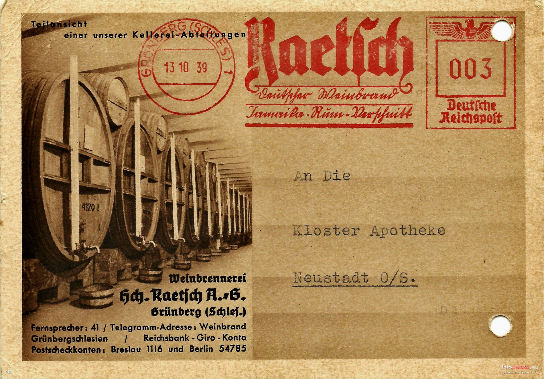 13 października 1939 , Firmowa pocztówka zielonogórskiej destylarni win wysłana 13 października 1939 r. do prudnickiej apteki "Klasztornej" w odpowiedzi na (prawdopodobne) przynaglenie na realizację zamówienia. Winiarnia tłumaczy opóźnienie ograniczeniami w dostawach surowców w związku z sytuacją wojenną.Skomentuj zdjęcie |