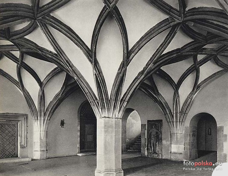 1 pobranie 1382 odsłony 5.89 średnia ocen Poprzednie i następne zdjęcia muzolph Obiekty widoczne na zdjęciu Sień więcej zdjęć (28) Wnętrza ratusza więcej zdjęć (22) Ratusz więcej zdjęć (318) Atrakcja turystyczna Zbudowano: ok.1480 Dawniej: Rathaus Ratusz pierwotny wzniesiono w połowie XIII w., co potwierdzają wzmianki z wieku następnego. Najstarsze partie budowli obecnej pochodzą z ok. 1480 r. obok wieży dostawionej do nich w latach 1500-1504. Obecną formę otrzymał ratusz po przebudowie w latach 1522-1524, projektowanej niewątpliwie przez Wendela Roskopfa przy współpracy monognamisty T.L., a obejmującej dekoracyjne sklepienia parteru, oraz po dalszych pracach przy elewacjach rozpoczętych ok. 1546 r. Ostatnia przebudowa z lat 1902-1905 powiększyła obiekt o handlowe podcienia w parterze i nową klatkę schodową od północy. Częściowo spalony w 1945 r., został odbudowany w latach 1955-1958. Obecnie jest to budynek murowany na rzucie prostokąta, dwukondygnacjowy, dwutraktowy, z wieżą od zachodu. Fasady wschodnia i zachodnaa ujęte są w pary szczytów o geometrycznych podziałach wewnętrznych. Fasadę południową akcentuje portal i szereg zdwojonych okien prostokątnych o ozdobnych obramieniach z kanclowanych pilastrów o roślinnej i maszkaronowej dekoracji. We wnętrzach szereg sal nakrytych skomplikowanymi w rysunku żeber sklepieniami sieciowymi oraz obszerna sień z centralnym filarem. Zgromadzono 'tu w pocz. XX w. szereg płyt nagrobnych z dawnego klasztoru franciszkańskiego z najciekawszą z nich - płytą księcia Henryka jaworskiego i jego żony Agnieszki, pochodzącą z ok. 1350 r. źródło : Pierwszym budynkiem pełniącym funkcję ratusza miejskiego był piętrowy Dom Kupców, wzniesiony na placu targowym w połowie XIII wieku, za czasów panowania Bolesława Rogatki. Ostatni wielki remont z przebudową dokonano w latach 1902-1905, pod okiem Hansa Poelziga. Wtedy też stworzono reprezentacyjną siedzibę burmistrza – obecnie Sala Ślubów oraz zamontowano wewnątrz wszystkie płyty epitafijne, przeniesione z klasztoru franciszkanów. Na trzecim co do wielkości rynku w Polsce, stoi gotycko-renesansowy ratusz lwówecki. Jest to budowla dwukondygnacyjna, na rzucie wydłużonego czworoboku, nakryta wysokim dachem dwuspadowym. Do elewacji zachodniej dostawiona jest kamienna wieża, o podstawie kwadratowej z galerią, z której wyłania się część walcowa z czterema zegarami, a wyżej część ośmioboczna z małymi otworami okiennymi, zwieńczona hełmem z prześwitem. W rozczłonkowanej bryle można dostrzec najstarszą cześć budowli – fragmenty dawnego Domu Kupców, z połowy XIII wieku. Jest to zachodnia cześć ratusza, przylegająca do wieży, z łukowymi oknami. Na północnej ścianie tego budynku, w płytkiej wnęce, zamontowano rzeźbę XVI wiecznego lwa, z łacińskim napisem: „który tłumaczy się: „sprawiedliwy jak lew”. Do Domu Kupców przylega budynek Ławy Sądowej. Jego szczyt widoczny jest tylko w połowie, gdyż drugą, południową stronę fasady, zasłoniła wieża, dostawiona później. Renesansowa elewacja południowa jest najefektowniejszą elewacją lwóweckiego ratusza. Ciekawe obramienia okienne, wzorowane na dojrzałym rzymskim renesansie, są czymś tak wyjątkowym na Śląsku, co każe przypuszczać, że twórcami tej kamieniarki musiał być zapewne jakiś mistrz włoski. Do dziś robią wrażenie podwójne renesansowe okna parteru. To właśnie południowy portal z bogatym obramieniem, od XVI wieku był głównym wejściem do ratusza. Główne wejście od strony południowej wiedzie przez renesansowy, efektowny portal do obszernej sieni, która była węzłowym miejscem ruchu wewnętrznego. Stąd można było wejść do winiarni w piwnicach, do Mieszczańskiej Sali Obrad lub schodami na piętro, do Ławy Sądowej i Sali Rajców. W sieni znajdują się dwie prostokątne, kamienne płyty nagrobne członków rodu rycerskiego – Talkenbergów. Obie płyty pochodzą z franciszkańskiego kościoła klasztornego. Nad schodami do piwnicy, średniowiecznej winiarni, znajdują się dwie kamienne rzeźby. Jedna z nich przedstawia męską postać z cyrklem w dłoniach i monogramem T.L. Co może symbolizować domniemanego budowniczego, ostatnio zidentyfikowanego, jako Tomas Lindener. Druga rzeźba przedstawia parę młodych w objęciach, ze splecionymi dłońmi. Z lewej strony sieni znajduje się wejście do Mieszczańskiej Sali Obrad. Było to największe pomieszczenie budynku, a jego główną ozdobą pozostało dziś sklepienie sieciowe Schody z sieni wiodą na pierwsze piętro, gdzie znajdują się następne trzy płyty epitafijne. Najefektowniejszą salą pierwszego pietra jest Sala Ślubów, wyłożona ciemnym drewnem, z drewnianym pseudosklepieniem. W rogach sali stoją cztery ozdobne filary, do których przylegają metalowe, ornamentowe kraty podtrzymujące spływy łuków sklepienia. Wnętrze ozdobione jest wieloma snycerskimi detalami oraz interesującymi neogotyckimi witrażami. Z Salą Ślubów sąsiadują pomieszczenia obecnie wykorzystywane jak Biblioteka Miejska. Na zachodniej stronie korytarza, od strony południowej, znajduje się pomieszczenie Ławy Sądowej. Na ścianie wschodniej zachowało się malowidło z uskrzydlonymi, kobiecymi alegoriami Z ławy Sądowej przechodzi się do sali tortur i usytuowanego w najniższej kondygnacji wieży lochu więziennego. Naprzeciwko Ławy Sądowej znajdują się dwa pomieszczenia, w których eksponuje się dziś zbiory tworzonego muzeum lwóweckiego, którym zarządza obecnie Lwówecki Ośrodek Kultury. Opracował : Andrzej Mateusiak, 2011 pl. Wolności więcej zdjęć (1588) Dawniej: Niedermarkt + Obermarkt, Marktplatz, Rynek |
