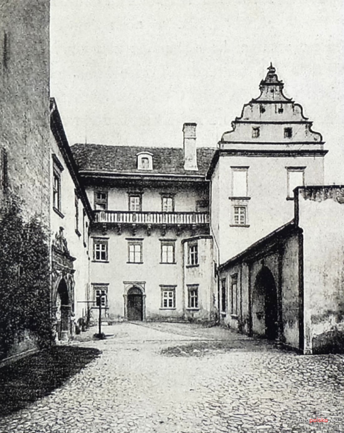 1909 , Dziedziniec zamku rycerskiego, później książęcego, wzniesionego na przełomie XIII/XIV w. Widoczny tzw. nowy zamek powstał w trakcie przebudowy w XVI w. Po prawej budynek bramny.Skomentuj zdjęcie |