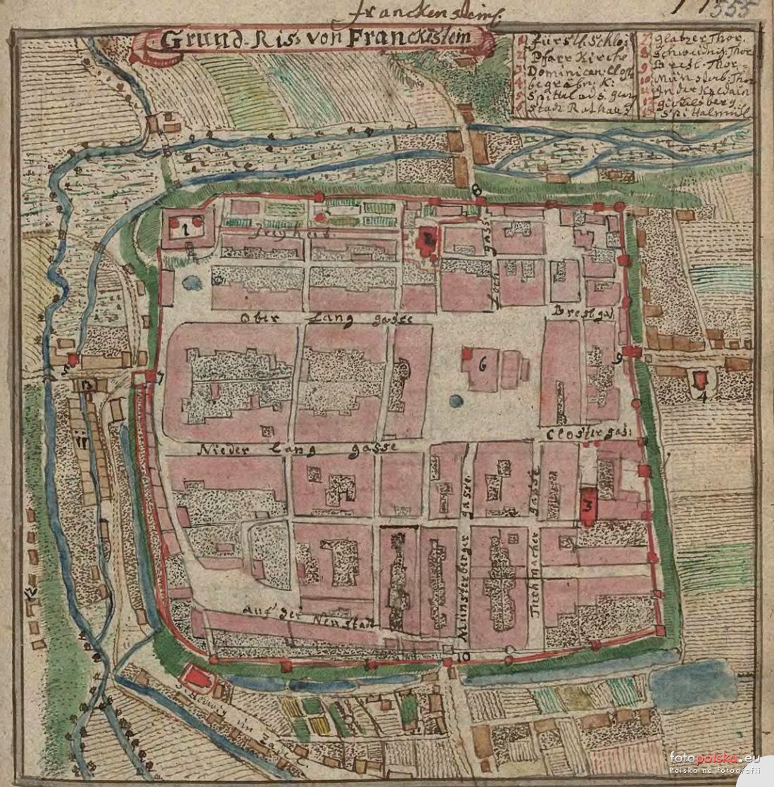Lata 1740-1760 , Plan Ząbkowic na rysunku F.B. Wernera z Topographia Seu Compendium Silesiae. Pars II (w Bibliotece Uniwersytetu Wrocławskiego). |