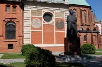 26/ Zegar słoneczny powstał ok.1490 roku wykonany przez matematyka, astronoma i gnomnika Mikołaja Wodkę z Kwidzyna. Zegar ten tradycja włocławska przypisuje Mikołajowi Kopernikowi, którego wuj późniejszy biskup warmiński Łukasz Watzenrode był kanonikiem we Włocławku. Mikołaj Wodka, który studiował w Bolonii, był profesorem we włocławskiej szkole katedralnej, która w XV i XVI wieku skupiła grono wybitnych ludzi epoki, biskupów humanistów, kanoników, kształcąc na poziomie quadrivium. Z tym kręgiem związani byli ludzie tej miary co Kallimach, prymas Maciej Drzewicki posiadacz pierwszego ekslibrisu w Polsce, Mikołaj Kopernik, prymas Stanisław Karnkowski, który założył w 1569 roku we Włocławku pierwsze w Polsce Seminarium Duchowne. W XVII wieku zegar przeniesiono na południową ścianę manierystycznej kaplicy pw. Najświętszej Marii Panny. Zegar jest wykonany w tynku, w formie dekoracji sgraffitowej, posiada gnomon, który wskazuje czas, długość dnia i aktualny znak zodiaku umieszczony na obrzeżu tarczy. Trudno określić w jakim stopniu obecny stan zegara odzwierciedla dzieło astrologa i medyka Abstemiusa [ok. 1442-1494]. Szkoła katedralna powstała w XII wieku, w XV i XVI wieku była filią Uniwersytetu Jagiellońskiego.