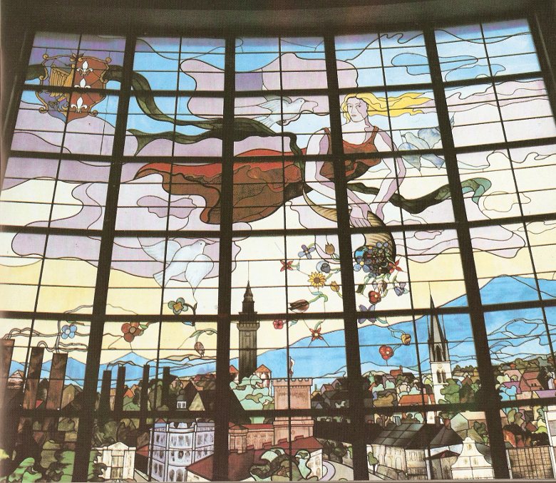 1992 , Witraż wypełniający elewację przeszklonego pawilonu gmachu ING Banku Śląskiego. Przedstawia panoramę miasta (z zabudową pl. Chrobrego na pierwszym planie), nad którą unosi się alegoria Obfitości. Zdjęcie z 1992 roku.Skomentuj zdjęcie |