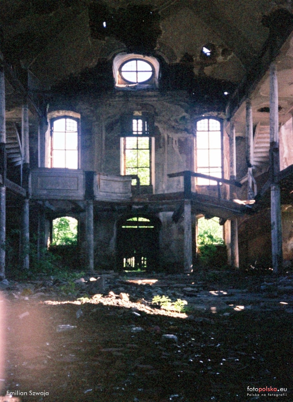 maj 2003 , Drugie z trzech zdjęć wykonanych tego dnia. Pamiętam, że obawiałem się wejść, aby nic nie spadło mi na głowę. Tu widok od strony wyrabowanego i widzę pozbawionego podwyższenia ołtarza. Wszedłem na "zakrystię" i stamtąd trzecia fotografia. Ciekawe kiedy była odprawiona ostatnia msza. Kościół był bez wątpienia ewangelicki, o czym świadczYŁY empory zachodzące aż nad ołtarz. Zdjęcie na pewno z maja- czerwca 2003, bo wtedy kończyłem gimnazjum.Skomentuj zdjęcie |