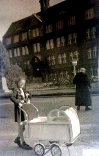 1956 , Gimnazjum nr 1 im. Powstańców Wielkopolskich. W tamtym czasie siedziba Rady Narodowej. Po lewej pomnik Jana Amosa Komeńskiego. Źródło:Skomentuj zdjęcie