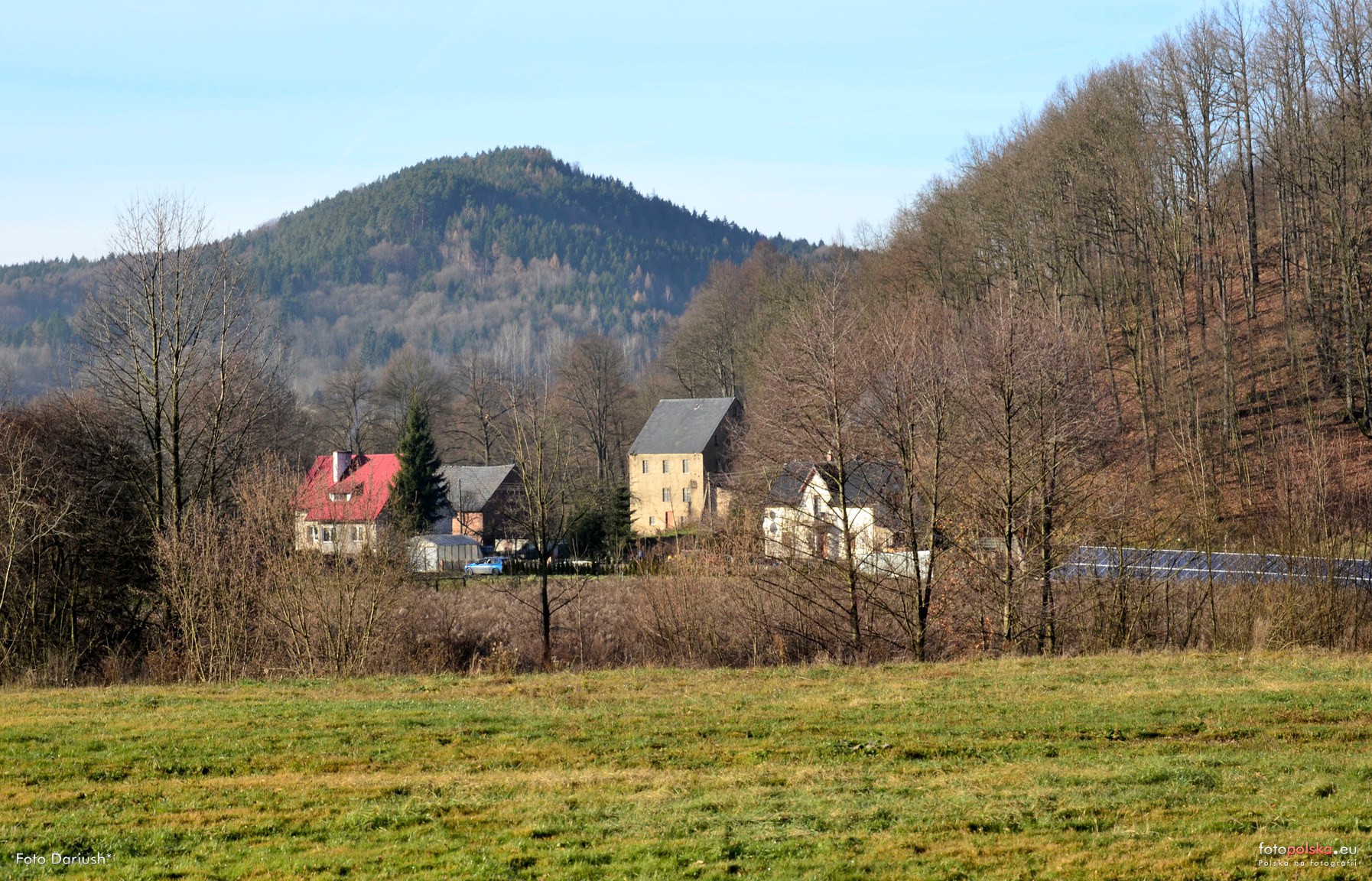 4 grudnia 2016 , Środek wsi z dominującą górą "Gniazdo", w centrum kadru charakterystyczny budynek młyna.Wąwozem na końcu zielonej łąki płynie Lipka (Chrośnicki Potok).Skomentuj zdjęcie |