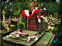 Lata 1980-1985 , Cmentarz katolicki. Dawna część wojskowa. Grób Nieznanego Żołnierza, usadowiony w miejscu, gdzie został pochowany, zmarły w bielawskim lazarecie 25.09.1940 r. kontradmirał (awans pośmiertny) Stefan Frankowski .Skomentuj zdjęcie